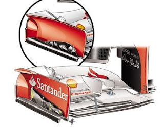 Introdujo un nuevo alerón delantero de Ferrari en Silverstone el viernes. La placa terminal nueva (vea el dibujo principal) es excelente particularmente diferente de la encarnación anterior (ver recuadro). La forma es mucho más sofisticado y cuenta con cuatro branquias verticales en vez de las tres habituales. Sin embargo, cuando un piloto Fernando Alonso dañado aletas delanteras de la nueva práctica Dos Durante su accidente, el equipo decidió volver a la solución más antigua para la calificación y la carrera